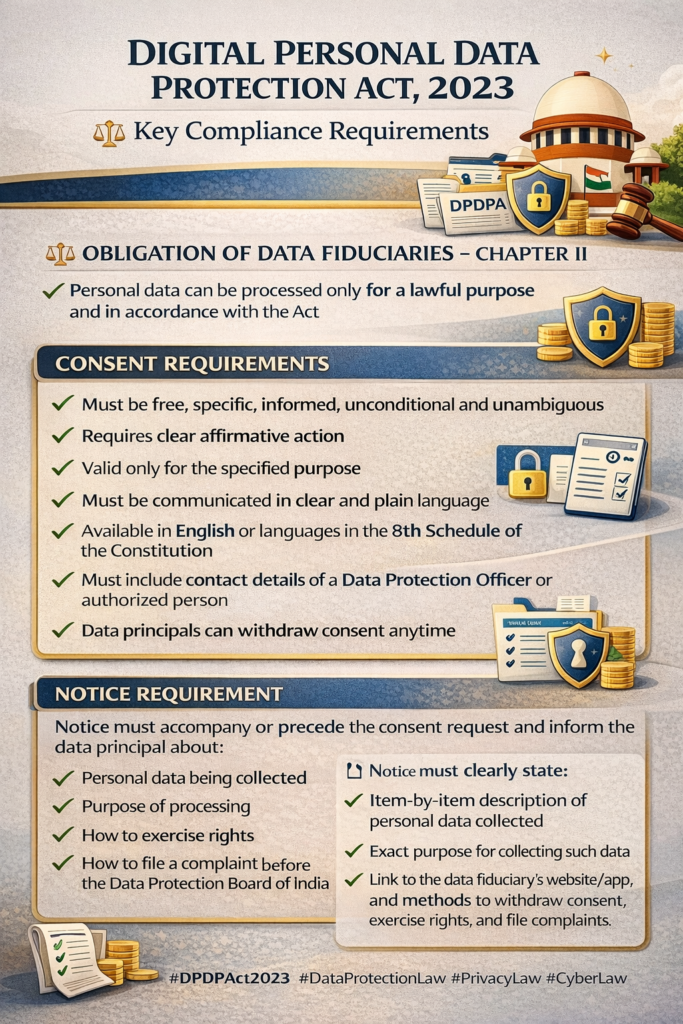 Through these provisions, the Digital Personal Data Protection Act, 2023 establishes structured compliance requirements governing how personal data may be processed and how data principals must be informed and empowered during the process.